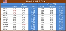 Потребительские цены в США в сентябре, согласно статистике BLS: месячный CPI с устранением сезонности составил 0.18% mm sa vs 0.19% в августе (ожидалось: 0.1% mm sa). Годовой показатель снизился до 2.44% гг vs 2.53% (ожидалось: 2.3% гг).