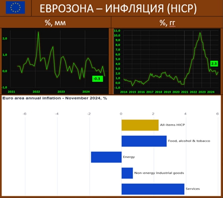 Рост цен в Еврозоне: предварительная оценка Eurostat гармонизированного показателя HICP, составила в ноябре 2.3% гг vs 2.0% гг и 1.7% гг двумя месяцами ранее. Помесячный показатель вновь опустился в область дефляции: -0.3% мм vs 0.3% мм и -0.1% мм. Базовый HICP - выше прогноза: 2.8% гг vs 2.7% гг (ждали 2.7%), -0.4% мм vs 0.3% мм