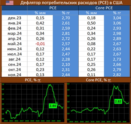 Вышедшая статистика BEA показывает, что в ноябре динамика PCE составила 0.13% мм/2.44% гг (ранее: 0.23% мм/2.31% гг), ждали 0.2% мм и 2.5% гг, а базовый индекс: 0.11% мм/2.82% гг (ранее: 0.26% мм/2.79% гг), прогноз: 0.2% мм и 2.9% гг.