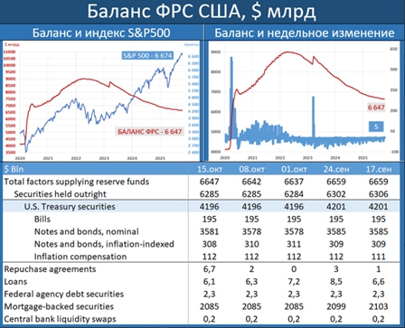 Баланс Федерального Резерва за последнюю неделю увеличился на $5 млрд. vs +$5 млрд. неделей ранее. Сейчас он составляет $6.647 трлн. С максимумов ($9.015 трлн) баланс снизился на -$2.368 трлн.