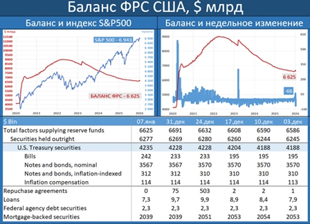 Баланс Федерального Резерва впервые за 5 недель уменьшился на -$66 млрд. vs +$59 млрд. неделей ранее. Сейчас он составляет $6.625 трлн. С максимумов ($9.015 трлн) баланс снизился на -$2.390 трлн.